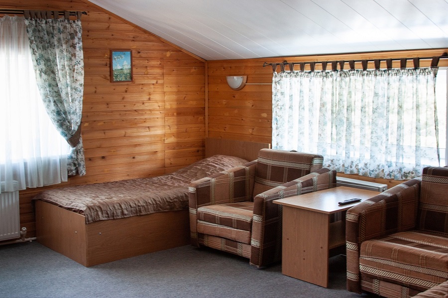 Гостевой дом «Дом Охотника» — это трехэтажный кирпичный коттедж на берегу озера Неро рядом с сосновым бором. В доме есть общая кухня и уютные двухместные номера с удобствами. В трехэтажном здании располагаются 10 номеров общей вместимостью до 40 человек. На первом этаже два номера и общая кухня, на втором и третьем этажах по четыре номера с видом на сосновый бор и озеро. В каждом номере имеется две односпальные кровати, кресла, стол, вешалка для одежды, телевизор, письменный стол. На общей кухне есть холодильник, микроволновая печь, вся необходимая посуда и кухонная утварь, стол и стулья.